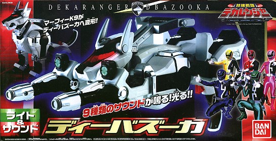日本BANDAI公司出品之特搜戰隊系列商品,可完全變形,有7種音效變化及紅綠兩種燈效(需使用4號電池2顆另購),外包裝紙盒大小:43x22x14公分